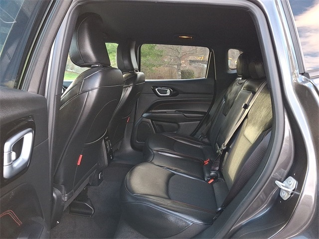 Quick Order Package 29E, Trailhawk Convenience Group (2nd Row USB Type A/C Charge Only, Heated Front Seats, Heated Steering Wheel, Power 2-Way Driver Lumbar Adjust, Power Adjust 8-Way Driver Seat, Remote Start System, Reversible Carpet/Vinyl Cargo Mat, and Windshield Wiper De-Icer), FCA US LLC Certified Pre-Owned Certified, 4WD, 10.1" Touchscreen Display, 4-Wheel Disc Brakes, 4.398 Final Drive Ratio, 6 Speakers, ABS brakes, Air Conditioning, Alloy wheels, AM/FM radio: SiriusXM, Auto High-beam Headlights, Auto-dimming Rear-View mirror, Automatic temperature control, Brake assist, Bumpers: body-color, Compass, Delay-off headlights, Disassociated Touchscreen Display, Driver door bin, Driver vanity mirror, Dual front impact airbags, Dual front side impact airbags, Electronic Stability Control, Four wheel independent suspension, Front anti-roll bar, Front Bucket Seats, Front Center Armrest w/Storage, Front dual zone A/C, Front fog lights, Front License Plate Bracket, Front reading lights, Fully automatic headlights, Heated door mirrors, Illuminated entry, Knee airbag, Leather Shift Knob, Low tire pressure warning, Occupant sensing airbag, Outside temperature display, Overhead airbag, Overhead console, Panic alarm, ParkView Rear Back-Up Camera, Passenger door bin, Passenger vanity mirror, Power door mirrors, Power steering, Power windows, Premium Cloth/Leather Trim Bucket Seats, Radio: Uconnect 5 w/10.1" Display, Rain sensing wipers, Rear anti-roll bar, Rear seat center armrest, Rear window defroster, Rear window wiper, Remote keyless entry, Security system, SiriusXM Radio Service, Speed control, Split folding rear seat, Spoiler, Steering wheel mounted audio controls, Tachometer, Telescoping steering wheel, Tilt steering wheel, Traction control, Trip computer, Turn signal indicator mirrors, Variably intermittent wipers, and Wheels: 17" x 6.5" Painted Black Aluminum.